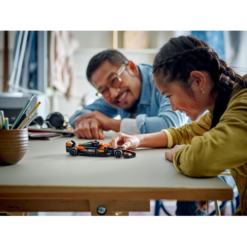 The F1 model car features a cockpit that opens by lifting the halo bar, a rear wing, wishbone suspension, sponsor stickers and wider rear tires imprinted with “Pirelli.” The toy vehicle also comes with a driver minifigure wearing a McLaren outfit and a winged helmet to place inside the cockpit for racing action.